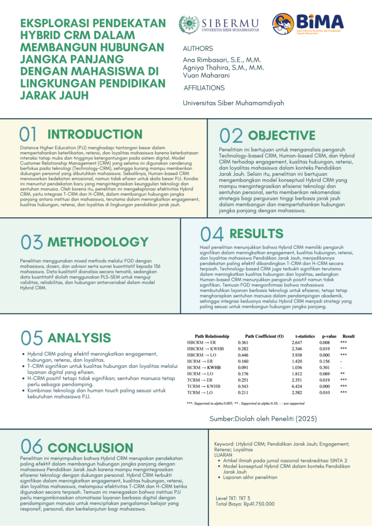 Melalui pendekatan Hybrid CRM—yang mengintegrasikan kekuatan teknologi dan sentuhan manusia—penelitian ini membuktikan bahwa model tersebut mampu meningkatkan engagement, kualitas hubungan, retensi, dan loyalitas mahasiswa secara signifikan. Data kuantitatif, yang dianalisis menggunakan metode PLS-SEM, secara tegas menunjukkan bahwa Hybrid CRM adalah prediktor paling kuat yang signifikan dalam membangun hubungan jangka panjang antara institusi dan mahasiswa.